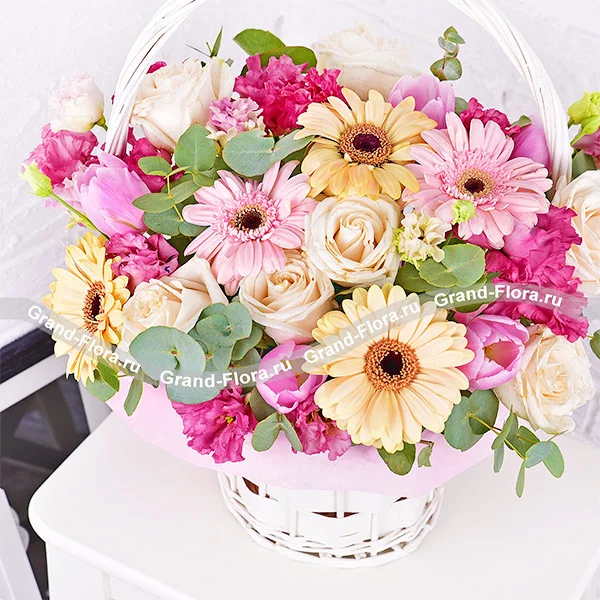 Уменьшенный: роза белая - 4 шт., гербера розовая - 1 шт., гербера желтая - 2 шт., тюльпан розовый - 4 шт., эустома розовая - 4 шт., эвкалипт, оазис, корзина. Примерный размер: 20Х20 см.