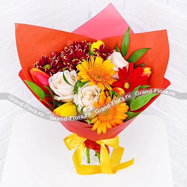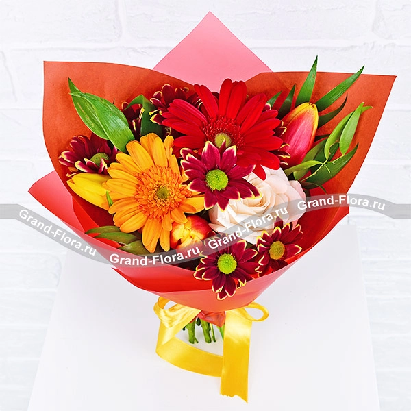 Стандартный: гербера красная - 1 шт., гербера оранжевая - 2 шт.,тюльпан желтый - 3 шт., тюльпан красный - 2 шт., роза белая - 3 шт., хризантема кустовая бардовая - 2 шт., декоративная зелень, упаковка, лента.