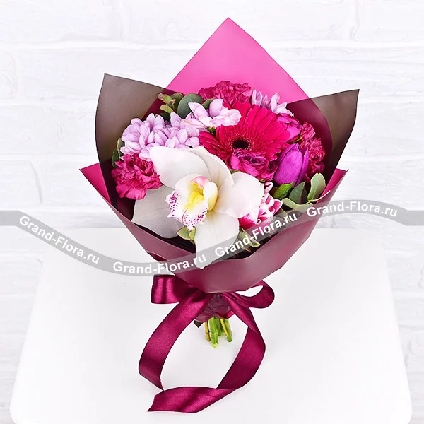 Уменьшенный: орхидея белая - 1 шт., гербера малиновая - 1 шт., хризантема кустовая розовая - 1 шт., эустома розовая - 1 шт., тюльпан розовый - 1 шт., тюльпан фиолетовый - 1 шт., роза кустовая фиолетовая - 1 шт., эвкалипт, упаковка, лента. Примерный размер: 20Х20 см.