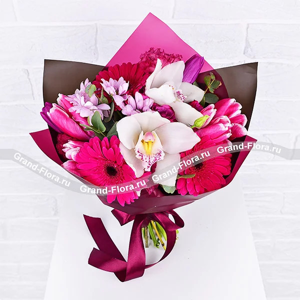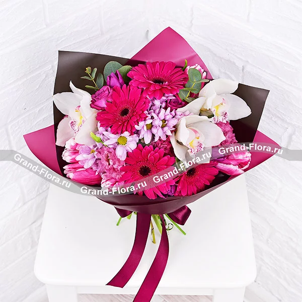 Стандартный: орхидея белая - 2 шт., гербера малиновая - 3 шт., хризантема кустовая розовая - 2 шт., эустома розовая - 3 шт., тюльпан розовый - 3 шт., тюльпан фиолетовый - 2 шт., роза кустовая фиолетовая - 2 шт., эвкалипт, упаковка, лента. Примерный размер: 30Х30 см.