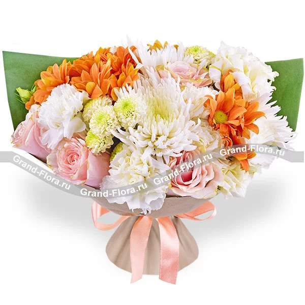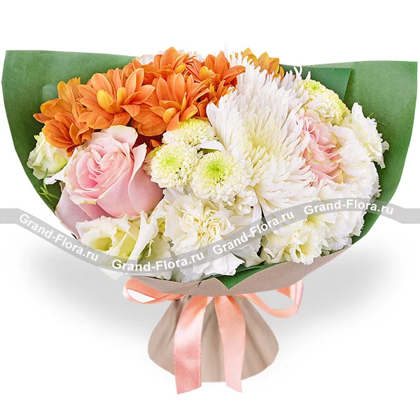 Стандартный: роза розовая - 4 шт., хризантема кустовая оранжевая - 2 шт., эустома белая - 2 шт., хризантема одноголовая белая - 2 шт., хризантема белая кустовая - 2 шт., гвоздика белая - 3 шт., упаковка, лента. Примерный размер: 35Х35 см.