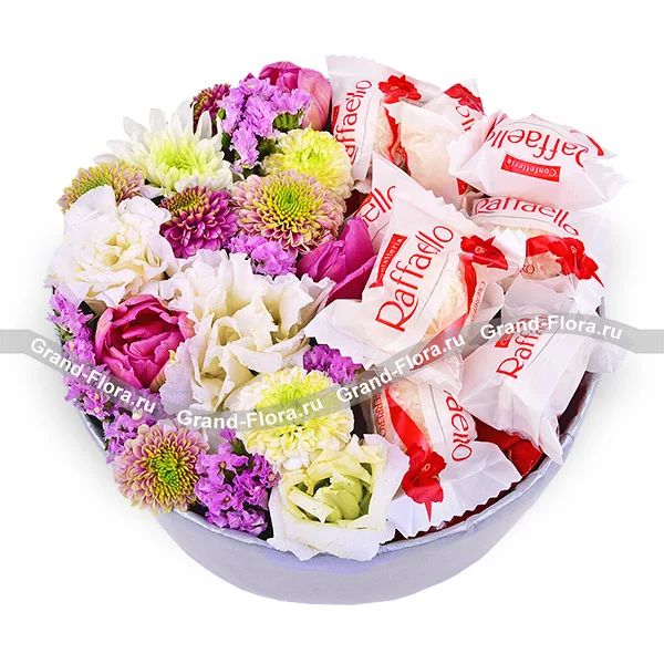 Стандартный: эустома белая - 1 шт., хризантема кустовая розовая - 1 шт., хризантема кустовая фиолетовая - 1 шт., тюльпан фиолетовый - 3 шт., хризантема кустовая белая - 1 шт., статица, конфеты "Raffaello" - 80 гр., оазис, коробка.