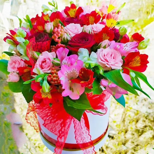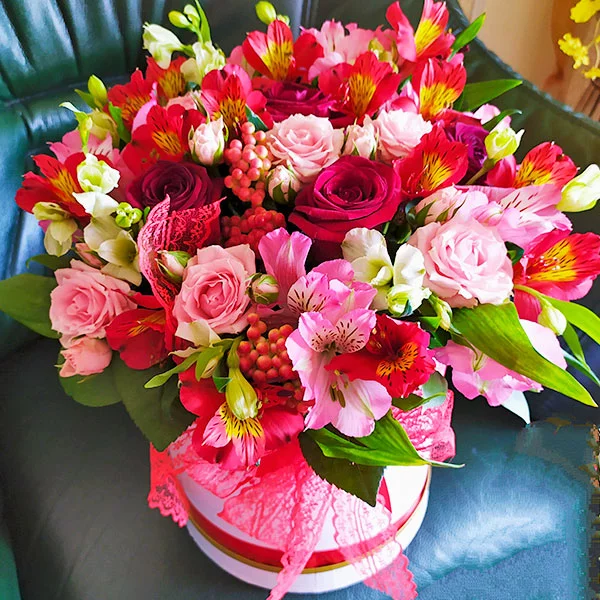 Уменьшенный: роза красная - 3 шт., роза кустовая розовая - 3 шт., эустома розовая - 1 шт.,гиперикум красный - 1 шт., декоративная зелень., оазис, коробка.