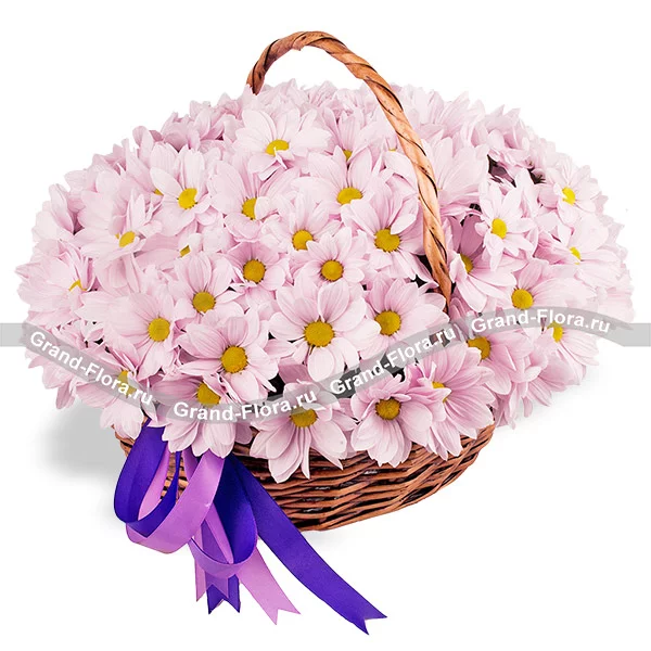 Стандартный: хризантема кустовая ромашковидная розовая - 9 шт., оазис, лента, корзина малая.