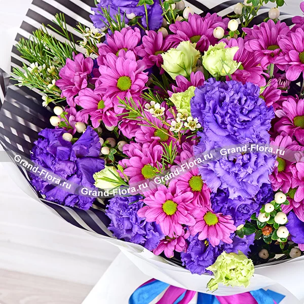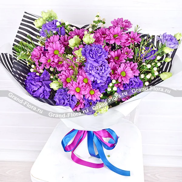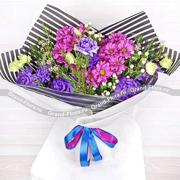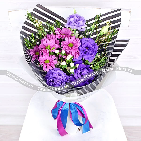 Фиолетовая хризантема и фиолетовая эустома в этом букете символизируют красоту и элегантность, а также добавляют элементы духовности и мудрости. Полосатая упаковка добавляет еще больше элегантности и изысканности к букету. Этот букет может быть прекрасным выбором для тех, кто хочет выразить свою мудрость или духовность или просто подарить красоту и гармонию кому-то близкому.