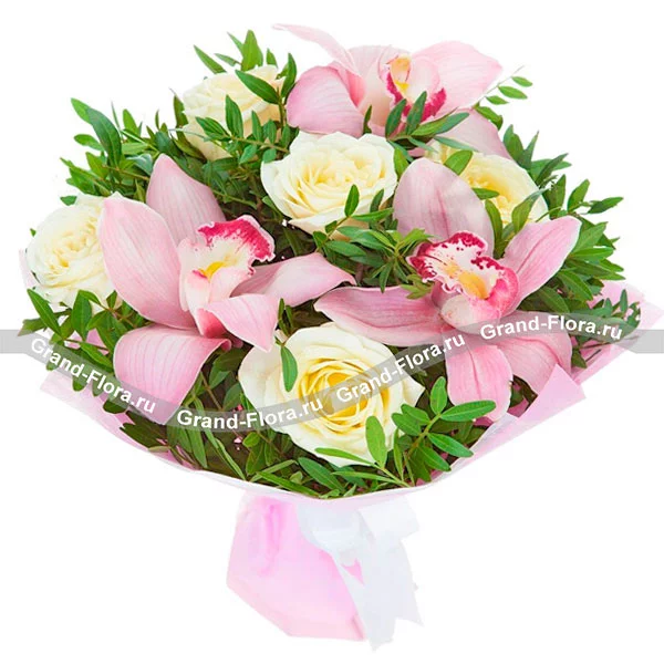 Изысканная  нежность орхидей и царственность роз в нежной, бело-розовой гамме - очаровывают с первого взгляда! Букет из этих невероятных цветов смотрится  притягательно и роскошно. Подарите изысканность и восторг. Эта композиция поможет вам выразить чувства, сделать приятный комплимент и подарить прекрасное настроение!