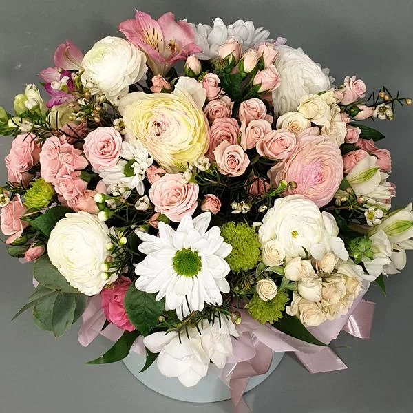 роза розовая - 2 шт.,  роза белая - 2 шт.,  кустовая роза розовая - 2 шт., кустовая роза белая - 2 шт., хризантема кустовая ромашковая  белая - 1 шт., альстромерия белая - 1 шт.,  декоративная зелень (хамелациум, львиный зев/возможна замена), оазис, коробка.