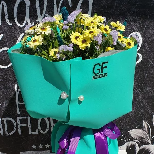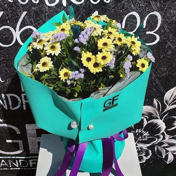 хризантема желтая кустовая ромашковая - 9 ., статица - 5 шт., салал, бирюзовая упаковка, лента Примерный размер: 30Х40 см.