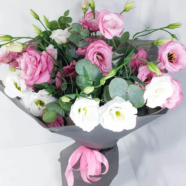 Стандартный: эустома розовая - 7 шт., эустома белая - 4 шт., декоративная зелень, упаковка крафт, лента розовая.