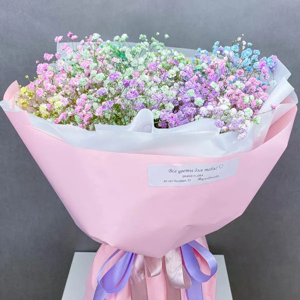 Невероятно красочный букет! Гипсофила радует глаз своей яркостью и разнообразием цветов. Доставили вовремя, все было идеально упаковано. Очень доволен покупкой!