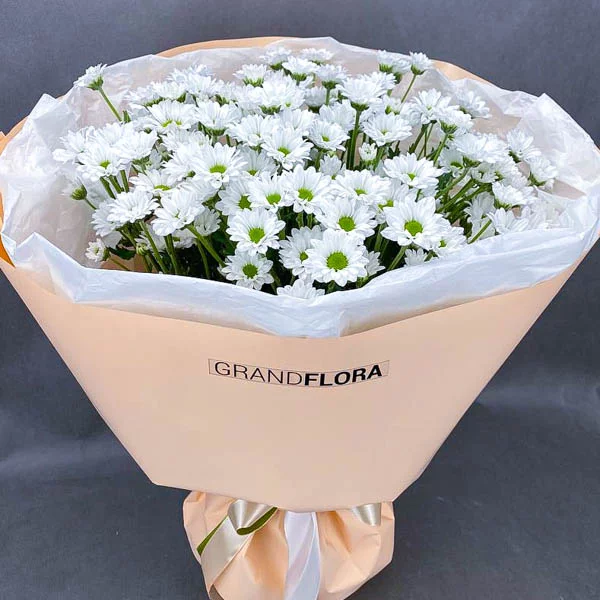 Белая кустовая ромашковидная хризантема (количество выбранное Вами), упаковка, лента