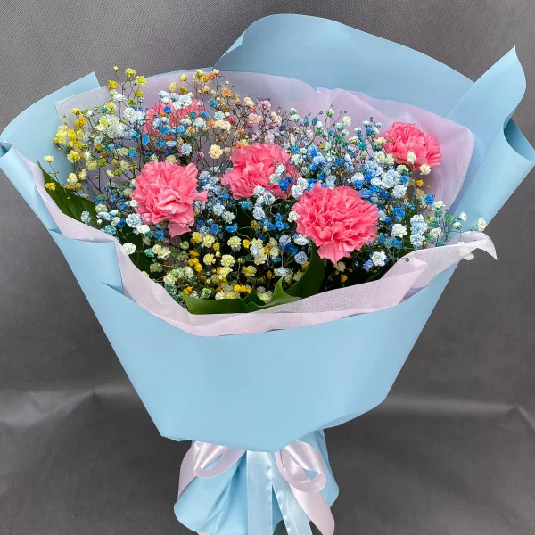 Уменьшенный, букет-комплимент: гипсофила радужная (возможно изменение оттенка) - 2 шт., гвоздика персиковая/розовая - 3 шт., упаковка, лента. Примерный размер букета: 20x25 см