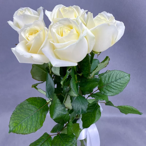 Роза белая (количество, выбранное Вами) 50-60 см, упаковка, лента. На фото представлен букет из 5 роз.