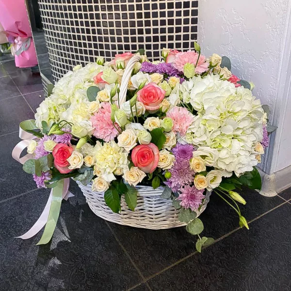 НА ФОТО: хризантема кустовая сиреневая(розовая) - 11 шт., роза кустовая белая - 7 шт., роза розовая - 8 шт., эустома белая (возможна замена на розовую) - 5 шт., диантус розовый/кремовый - 14 шт., гортензия белая - 1 шт, декоративная зелень, оазис, корзина