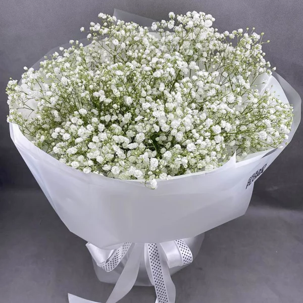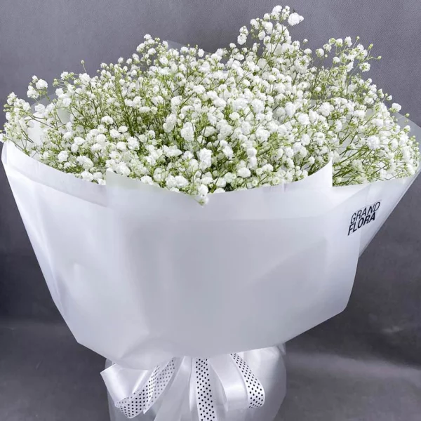 Букет - это инновационный и оригинальный букет, который состоит из гипсофилы. Гипсофила это цветок котрый имеет длительный срок хранения. Букет оформлен в упаковку, которая имеет оригинальный дизайн в виде гороха. Этот дизайн добавляет букету дополнительную интересность и оригинальность, делая его идеальным для подарка или декора. Букет может быть использован в различных ситуациях, он идеален как как подарок на день рождения, на конференции или для декора интерьера. В зависимости от предпочтений заказчика, букет может быть сделан в различных размерах и с различным количеством цветов.
