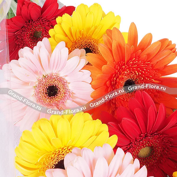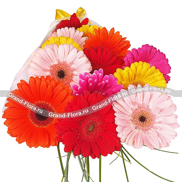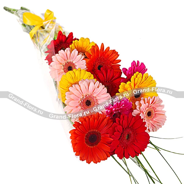 Стандартный:  гербера разноцветная- 15 шт, декоративная зелень, сетка.